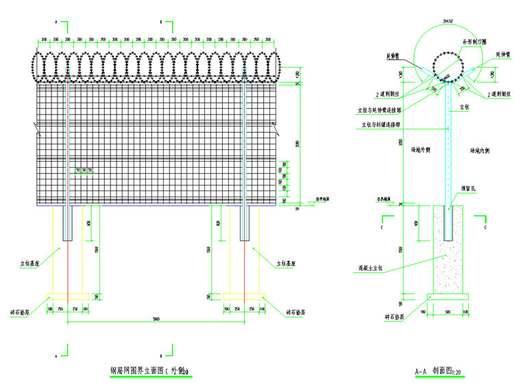 4、圍界的基座采用C30鋼筋水泥混凝土預(yù)制,預(yù)留孔在立柱放置后用C30細(xì)石混凝土灌實(shí)。基座和地梁的墊層采用粒徑0-5cm的級(jí)配碎石。