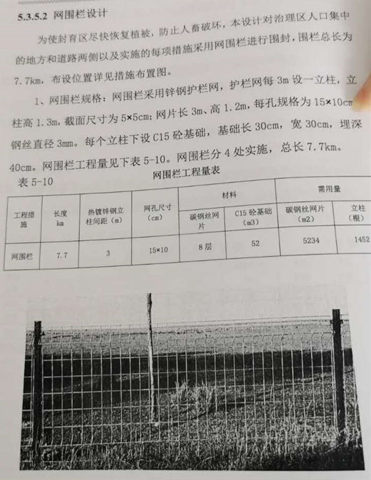 為使封育區(qū)盡快恢復植被,防止人畜破壞,本設計對治理區(qū)人口集中的地方和道路兩側以及實施的每項措施采用網圍欄進行圍封,圍欄總長為7.7公里,生態(tài)恢復網圍欄分四處安裝實施,布設位置詳見措施布置圖。