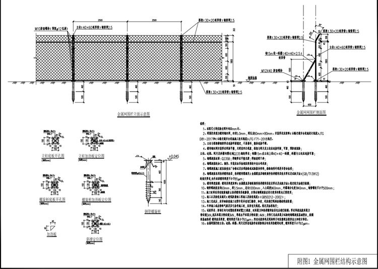 2、金屬網(wǎng)圍欄類型為鍍鋅鋼絲網(wǎng),絲徑5.0mm ,網(wǎng)孔為80mmx80mm.安裝要求應(yīng)按照《公路交通安全設(shè)施設(shè)計規(guī)范》JTGD81- 2017和《公路交通安全設(shè)施施工技術(shù)規(guī)范》JTG F71-2018執(zhí)行。