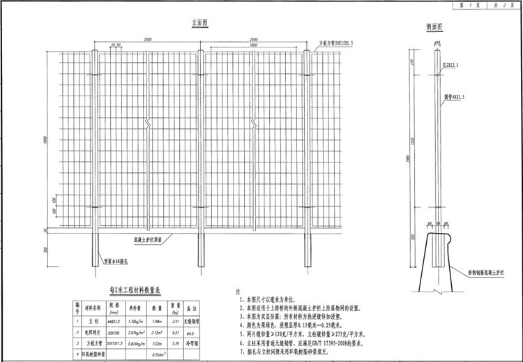 支線上跨橋外側(cè)混凝土護欄或梁柱式鋼護欄上均應(yīng)設(shè)置防落物網(wǎng),防落物網(wǎng)所有材料熱浸鍍鋅加浸塑,網(wǎng)片鍍鋅量120g/㎡,網(wǎng)片浸塑層厚度150μm,立柱鍍鋅量275g/㎡,立柱浸塑層厚度250μm。立柱采用普通無縫鋼管,混凝土護欄頂部預(yù)留立柱插孔,預(yù)留孔的垂直度偏差不超出1%,預(yù)留孔與立柱間隙采用環(huán)氧樹脂砂漿填充。同時,防落物網(wǎng)應(yīng)做好防雷接地處理,接地電阻應(yīng)小于10Ω。