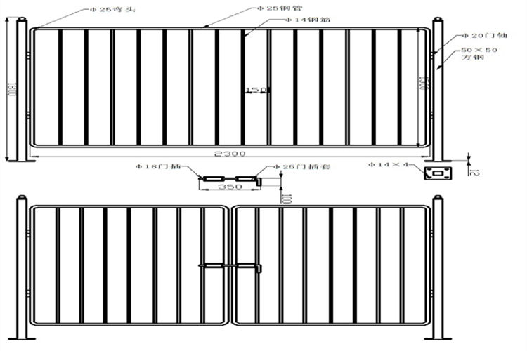 12、門式防護(hù)欄還需配有φ18門插,350mm×100mm,且門插軸與套公差不得大于0.2mm;供貨時(shí)除φ20門軸的凸軸無(wú)需焊接外,其余需成品供貨。