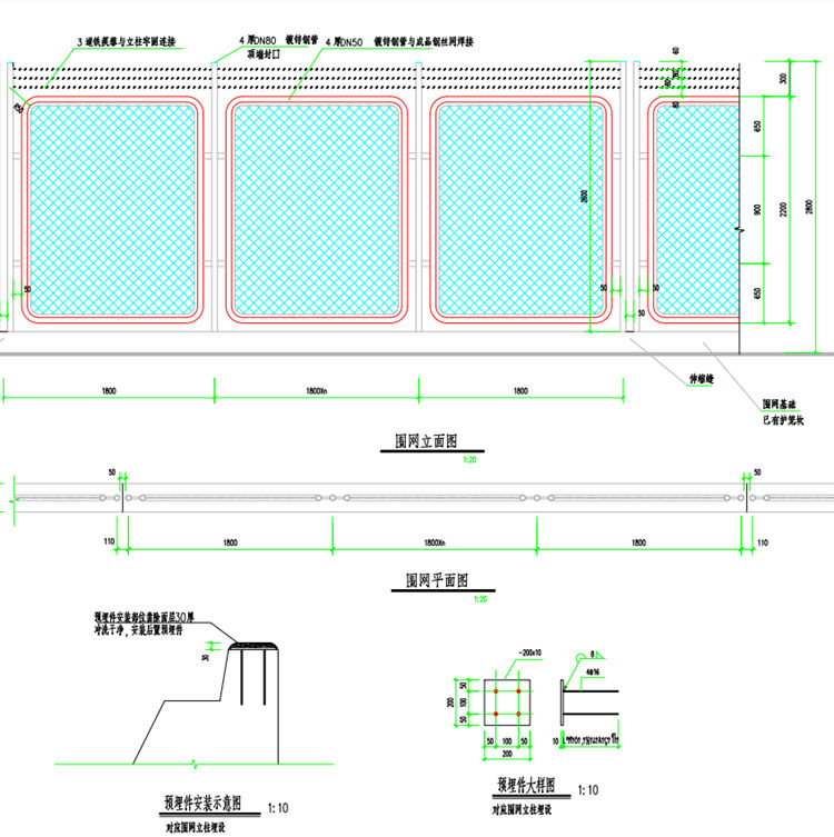 4、圍網(wǎng)其他注意事項(xiàng):圖中尺寸單位在本設(shè)計(jì)說(shuō)明及圖紙中均以毫米計(jì),標(biāo)高以米計(jì);圖中未注明事宜均按現(xiàn)行建筑工程及驗(yàn)收技術(shù)規(guī)范進(jìn)行施工;施工中應(yīng)注意與各專業(yè)圖紙配合并做好預(yù)埋件及預(yù)留孔洞。