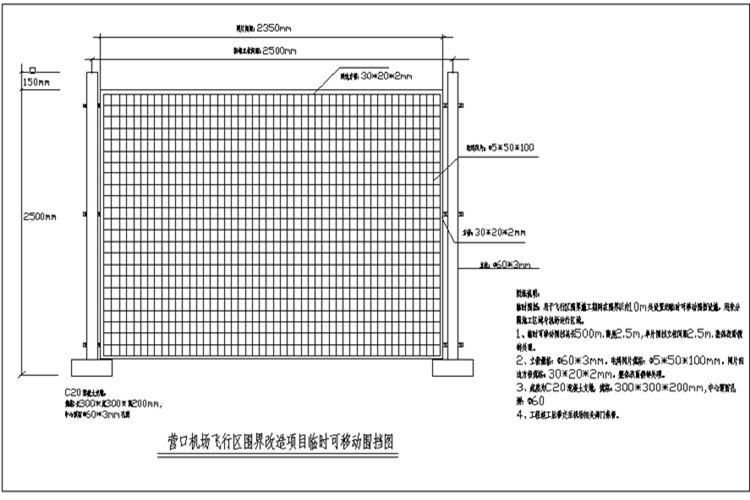 3、飛機(jī)場項(xiàng)目工地臨時(shí)可移動(dòng)圍擋立柱規(guī)格Φ60*3.0mm,網(wǎng)片規(guī)格50*100*5mm,網(wǎng)片四周方管規(guī)格20*30*2mm,整體表面鍍鋅處理。