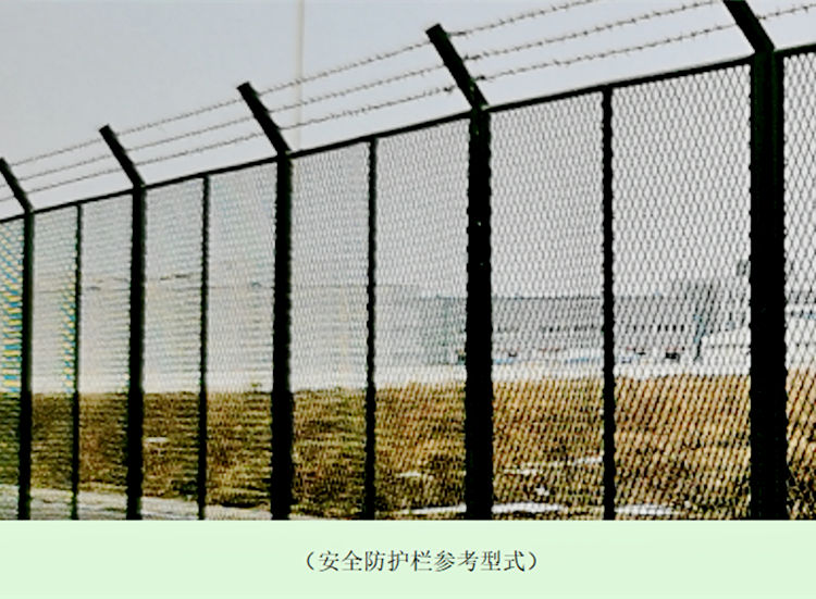 4、安全防護欄總高不小于2.3m,其中圍欄主體部分2m,上面熱鍍鋅刀片刺繩3道、高約0.3m。