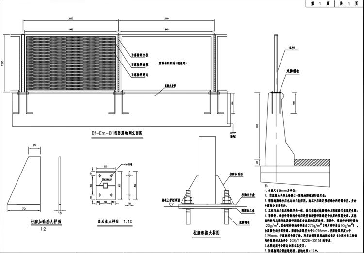 60mm,跨公路的防落物網(wǎng)網(wǎng)片高1.2m。網(wǎng)片焊接于角鋼邊框上。除緊固件、地腳螺栓、預(yù)埋法蘭盤采用熱浸鍍鋅處理外,其它構(gòu)件均應(yīng)進(jìn)行涂塑處理,涂塑層顏色采用薄荷綠;防腐符合《公路交通工程鋼構(gòu)件防腐技術(shù)條件》GB/T18226-2015 的要求。