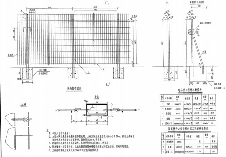 4、隔離柵開口處設(shè)置斜撐,立柱及斜撐預(yù)留N8螺栓孔并通過M6螺栓連接,基礎(chǔ)采用現(xiàn)澆。