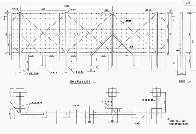 2、本圖適用于刺鋼絲隔離柵的一般布設(shè)。