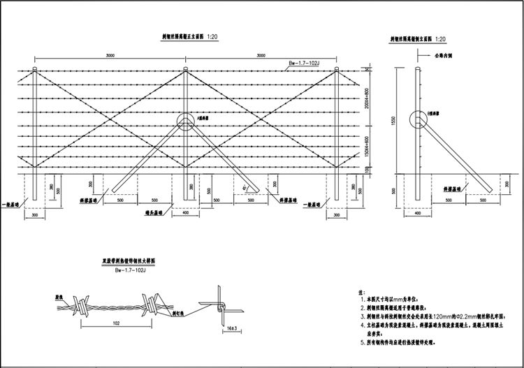 6、刺鋼絲隔離柵的立柱間距為3.0m,兩個雙向斜撐間距為30m。兩個三向斜撐間距為90m,凡拐角處均應設置單向斜撐;