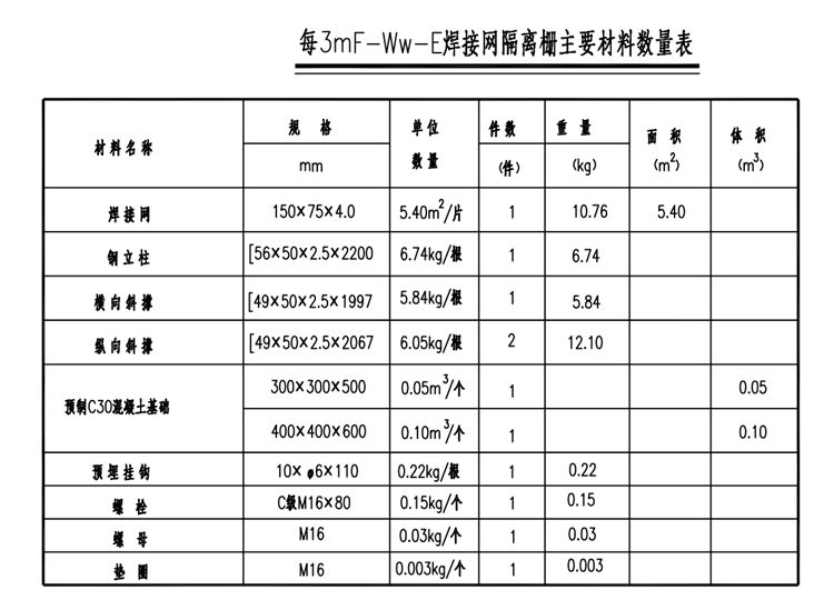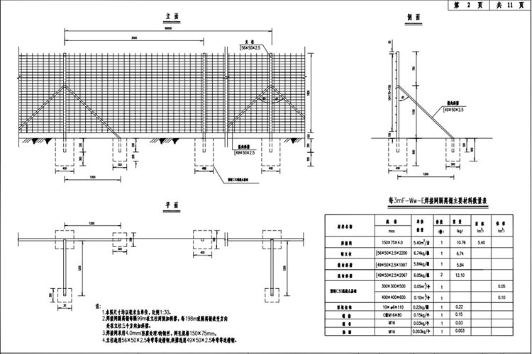 本圖尺寸均以毫米為單位,比例1:30。焊接網(wǎng)隔離柵每隔99m在立柱兩側(cè)加斜撐,每198m或隔離柵改變方向處在立柱三個(gè)方向加斜撐。焊接網(wǎng)采用4.0mm(防腐處理)的鋼絲,網(wǎng)孔規(guī)格150X75mm。立柱選用56X50X2.5冷彎等邊槽鋼,斜撐選用49X50X2.5冷彎等邊槽鋼。隔離柵設(shè)置于公路用地界內(nèi)側(cè)0.3m 處,地形有起伏時(shí),片網(wǎng)隔離柵按階梯形設(shè)置;片網(wǎng)隔離柵遇到≤3m 的溝渠或涵洞時(shí),可直接跨過(guò),但在跨躍處需設(shè)置異形網(wǎng)片,防止人或動(dòng)物由此進(jìn)入。每段隔離柵的起終點(diǎn)或隔離柵需要斷開的地方,應(yīng)針對(duì)不同的情況做端頭圍封,在隔離柵需改變方向的地方,應(yīng)做拐角處理。焊接片網(wǎng)隔離柵采用熱浸鍍鋅涂塑處理,螺栓、螺母、墊圈等連接件的鍍鋅量為120g/㎡,立柱等構(gòu)件為275g/㎡,網(wǎng)片塑層厚度不小于0.3mm。立柱等鋼構(gòu)件塑層厚度不小于76μm,焊接網(wǎng)隔離柵的鋼構(gòu)件均應(yīng)作熱浸鍍鋅后鍍塑處理。鍍鋅時(shí)應(yīng)符合下表的規(guī)定,熱浸鍍鋅所用的鋅應(yīng)為符合《公路交通工程鋼構(gòu)件防腐技術(shù)條件》中引用的 GB/T470中所規(guī)定的特1號(hào)或1號(hào)鋅錠,鍍鋅后再浸塑或噴塑,顏色為果綠色。所有鋼構(gòu)件均應(yīng)進(jìn)行熱浸鍍鋅涂塑處理,螺栓、螺母、墊圈等連接件的鍍鋅量為120g/㎡,其它構(gòu)件為275g/㎡,網(wǎng)片塑層厚度不小于0.3mm。其它鋼構(gòu)件涂塑層厚度不小于76μm。