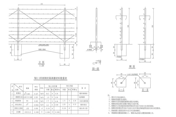 刺鋼絲網(wǎng)隔離柵采用圓鋼管立柱。刺絲采用12號(hào)低碳鋼絲或低合金鋼絲制作,應(yīng)符合《一般用途低碳鋼絲》(CB343)。《一般用途熱鍍鋅低碳鋼絲》的規(guī)定。刺鋼絲網(wǎng)隔離柵立柱、斜撐、門柱采用先鍍鋅后浸塑方式,鍍鋅量不得低于275g/㎡,緊固件、連接件為120g/㎡, 涂塑層厚度應(yīng)大于0.25mm.具體參見《公路交通工程鋼構(gòu)件防腐蝕技術(shù)條件》(GB/T 18226-2015)。