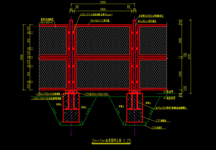 2.圍網(wǎng)網(wǎng)面以Q235低碳鋼板切割擴(kuò)張制成,網(wǎng)面與方通應(yīng)采用面接,接觸長度不小于20mm,鋼板網(wǎng)尺寸采用長節(jié)距100mm,短節(jié)距60mm,梗寬4mm,鋼板厚4mm,未盡部分詳見詳見《隔離柵》(GB/T 26941-2011)。