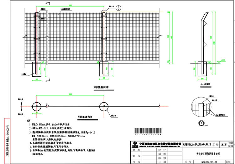 3、光伏場區(qū)焊接網(wǎng)隔離柵的立柱及網(wǎng)片采用先熱浸鍍鋅再鍍塑的防腐處理措施,立柱采用Φ45x1.5鋼管,網(wǎng)絲直徑4mm,經(jīng)向網(wǎng)孔尺寸170mm ,緯向網(wǎng)孔尺寸90mm。采用帶邊框的絲網(wǎng),邊框樣式由業(yè)主選擇。