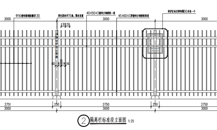 5.鋅鋼護(hù)欄鋼柱下端焊接于基礎(chǔ)后,端部與預(yù)埋鋼板均需做防銹處理及表面涂裝。
