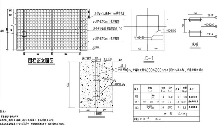 2、熱鍍鋅圍欄的鋼管立柱基坑尺寸:800*800*1000mm (長(zhǎng)*寬*深) ;基礎(chǔ)底部夯實(shí),C15混凝土墊層; 現(xiàn)澆混凝土標(biāo)號(hào): C30砼混凝土澆筑,基礎(chǔ)四周回填素土分層夯實(shí)。
