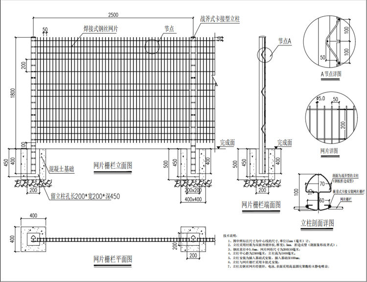 5、網片柵欄立柱安裝為插入基礎式安裝,插入基礎深400mm。