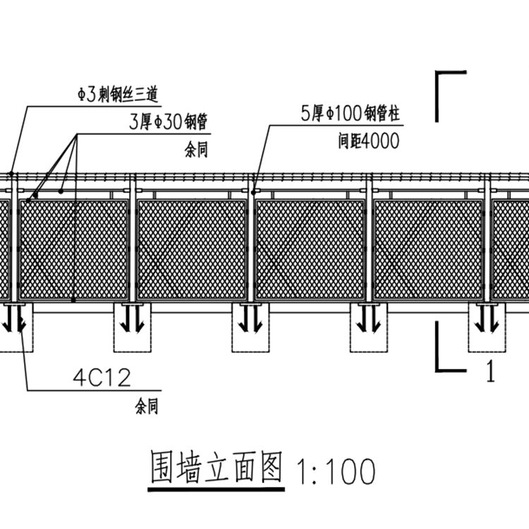 3、金屬圍墻網(wǎng)絲Φ5.0mm,網(wǎng)孔對角線100*100mm,網(wǎng)片焊接制作而成。