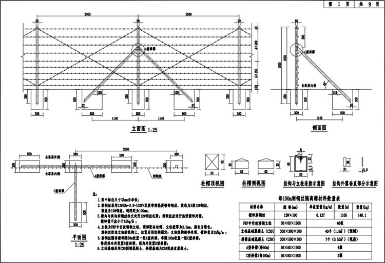6.刺鋼絲隔離柵立柱基礎(chǔ)采用C30預(yù)制混凝土,斜撐基礎(chǔ)為C30現(xiàn)澆素混凝土。