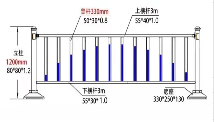 1.鋅鋼護(hù)欄尺寸為:3米*1.2米,底座為鑄鐵,具備地面安裝固定。