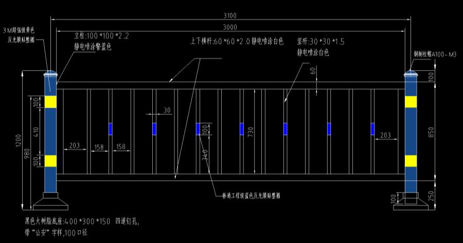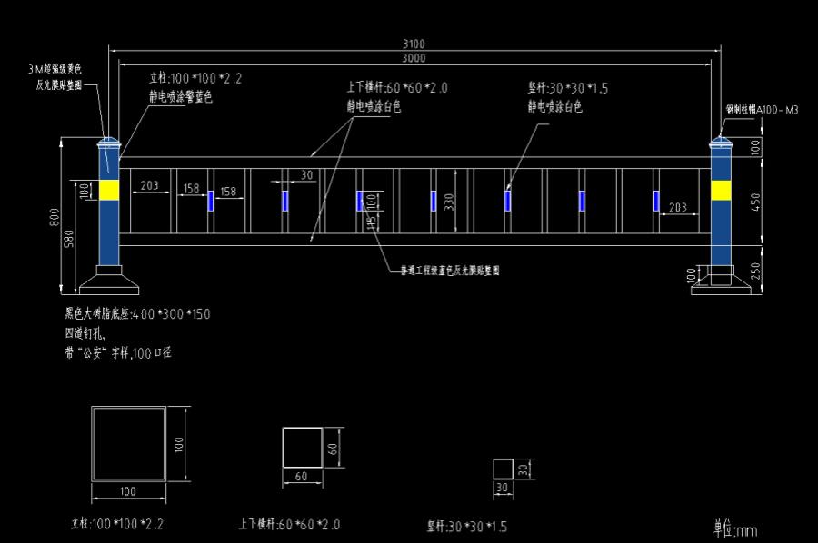 豎管 30*30*1.5mm; 四周邊框 60*60*2.0mm; 立柱 100*100*2.2mm; 帶反光膜,樹(shù)脂底座。