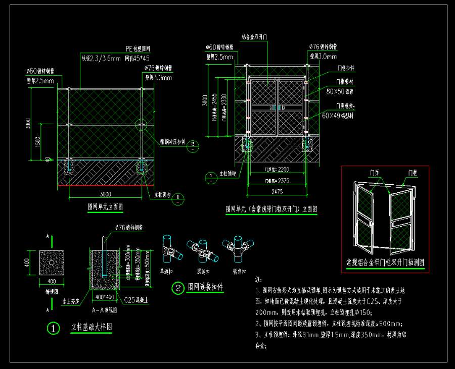 3、材質(zhì)參數(shù):圍網(wǎng)立柱采用?76鍍鋅鋼管,壁厚3.0mm;橫桿采用?60鍍鋅鋼管,壁厚2.5mm;扣件采用精鋼沖壓扣件;網(wǎng)片采用PE包塑網(wǎng)片,內(nèi)徑2.3mm,外徑3.6mm,網(wǎng)孔45*45mm;扁鋁采用20*4mm鋁合金壓條。立柱、橫桿均使用熱鍍鋅鋼結(jié)構(gòu)型材,表面除油酸洗、磷化、聚酯粉末靜電噴涂,涂層>40um。