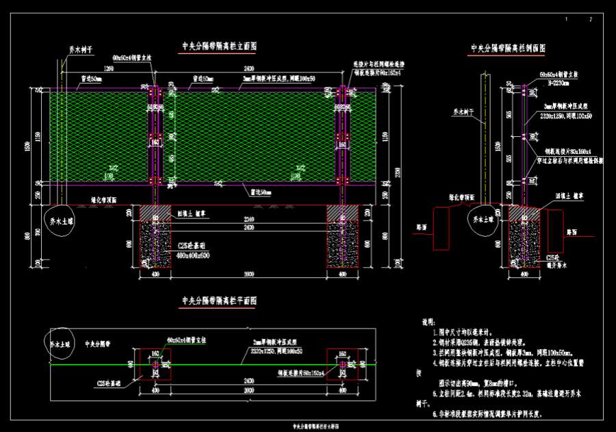 5.立柱間距2.4m,欄網(wǎng)標(biāo)準(zhǔn)段長(zhǎng)度2.32m,基礎(chǔ)注意避開喬木樹干。