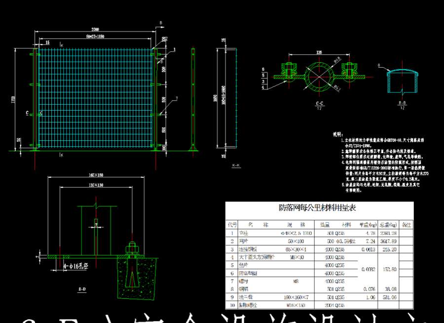 鋅量:網(wǎng)片為每平方米90克,立柱橫梁等為每平方米270克,第二層涂層為聚氯乙烯,厚度不小于0.3毫米。