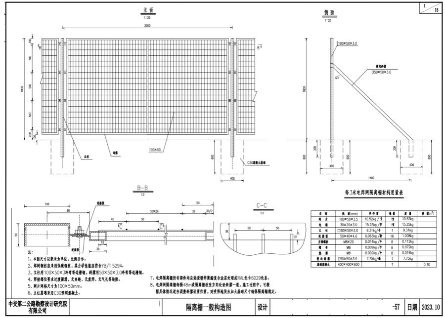 8、電焊網隔離柵每隔48m或隔離柵改變方向處設斜撐一道,施工過程中,可根據具體情況適當調整斜撐設置位置,對受限地段應加大基礎尺寸確保隔離柵穩(wěn)定。