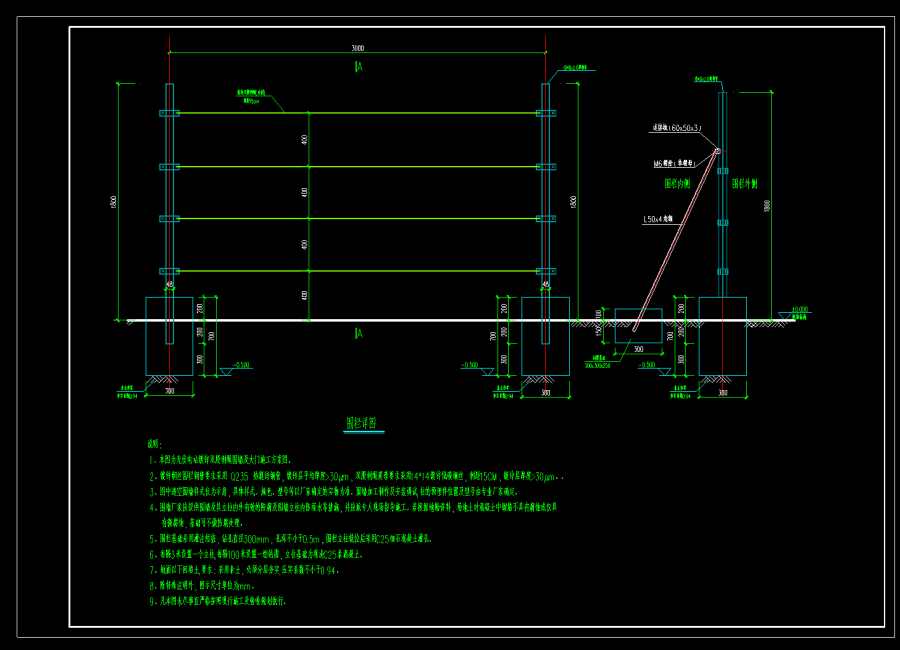 5、圍欄基礎(chǔ)采用灌注短樁,鉆孔直徑300mm,孔深不小于0.5m,圍欄立柱就位后采用C25細(xì)石混凝土灌孔。