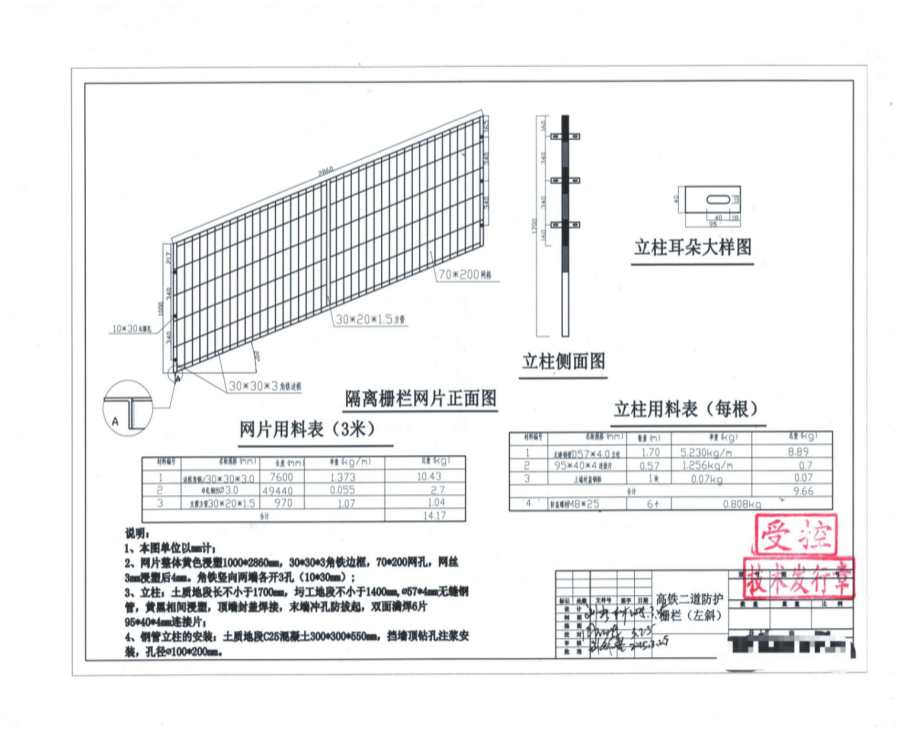 2、網(wǎng)片整體黃色漫塑1000*2860mm,30*30*3角鐵邊框,70*200網(wǎng)孔,網(wǎng)絲3mm漫塑后4mm。角鐵豎向兩端各開3孔(10*30mm)。