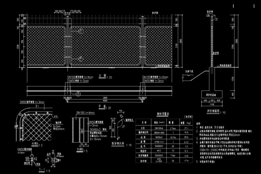 2、邊框采用鍍鋅鋼管、轉(zhuǎn)彎煨彎、接頭對焊, 焊接處鍍鋅防腐,鋼絲網(wǎng)采用成品,規(guī)格為10#鍍鋅鐵絲,網(wǎng)孔50mm。