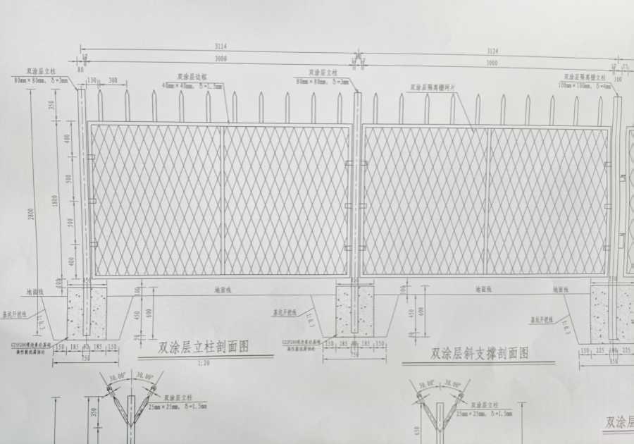 2、雙涂層隔離柵Gw-3.0-55: (網(wǎng)片采用鋼片網(wǎng),網(wǎng)片規(guī)格3mx1.8m,厚度3.0m,網(wǎng)孔尺寸55mmx150mm(菱形對(duì)角尺寸),邊框及豎桿方管40mmx40mmx1.5mm,配件包括:防雨帽、連接卡及防盜螺栓等):方管立柱采用80mmx80mm,壁厚3.0m,單根立柱長2.8m,間距3m,立柱與網(wǎng)片的連接方式為焊接。立柱基礎(chǔ)C25F200(高性能抗腐蝕砼)現(xiàn)澆混凝土基礎(chǔ),規(guī)格尺寸:0.45x0.45x0.6m(長x寬x高)。