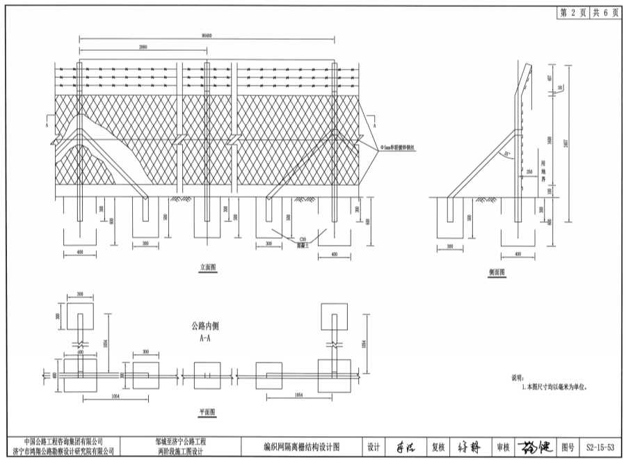 2.隔離柵沿公路用地界布置,立柱在用地界內(nèi)側(cè)25cm處。