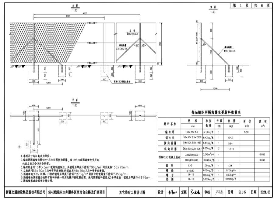 2.編織網(wǎng)隔離柵每隔99m在立柱兩側(cè)加斜撐,每18m或隔離柵改變方向處在立柱三個方向加斜撐。